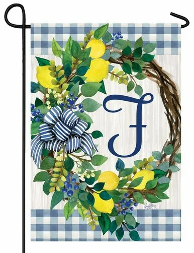 You love your home so show it with this Monogramed letter “F” decorative garden flag. The artwork shows a grapevine wreath decorated with eucalyptus and lemons surrounding a blue embroidered letter “F” against whitewashed background and blue and white gingham plaid borders across the top and bottom of the design. The wreath is decorated with a blue and white striped bow. This double sided flag consists of two separate panels sewn together back to back, so the embroidered letter reads correctly on both sides. What a charming decorative garden flag to display at your home. Flag size 12” x 18”. Artwork by Jennifer Nilsson.