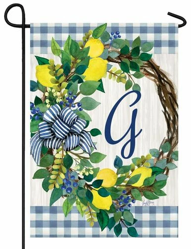 You love your home so show it with this Monogramed letter “G” decorative garden flag. The artwork shows a grapevine wreath decorated with eucalyptus and lemons surrounding a blue embroidered letter “G” against whitewashed background and blue and white gingham plaid borders across the top and bottom of the design. The wreath is decorated with a blue and white striped bow. This double sided flag consists of two separate panels sewn together back to back, so the embroidered letter reads correctly on both sides. What a charming decorative garden flag to display at your home. Flag size 12” x 18”. Artwork by Jennifer Nilsson.