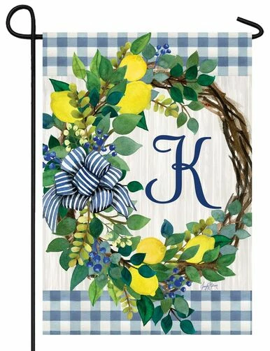 You love your home so show it with this Monogramed letter “K” decorative garden flag. The artwork shows a grapevine wreath decorated with eucalyptus and lemons surrounding a blue embroidered letter “K” against whitewashed background and blue and white gingham plaid borders across the top and bottom of the design. The wreath is decorated with a blue and white striped bow. This double sided flag consists of two separate panels sewn together back to back, so the embroidered letter reads correctly on both sides. What a charming decorative garden flag to display at your home. Flag size 12” x 18”. Artwork by Jennifer Nilsson.