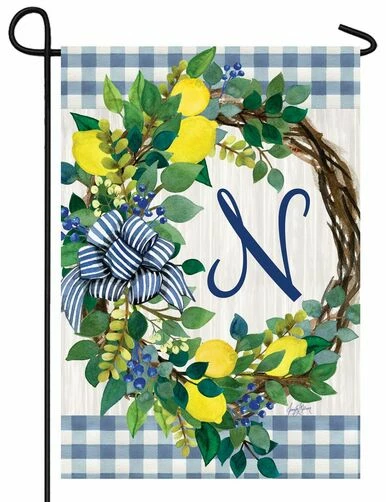 You love your home so show it with this Monogramed letter “N” decorative garden flag. The artwork shows a grapevine wreath decorated with eucalyptus and lemons surrounding a blue embroidered letter “N” against whitewashed background and blue and white gingham plaid borders across the top and bottom of the design. The wreath is decorated with a blue and white striped bow. This double sided flag consists of two separate panels sewn together back to back, so the embroidered letter reads correctly on both sides. What a charming decorative garden flag to display at your home. Flag size 12” x 18”. Artwork by Jennifer Nilsson.