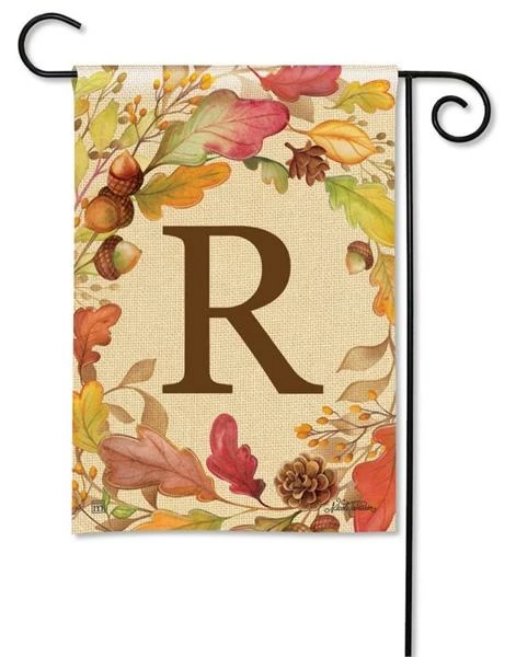 This letter R monogrammed garden flag is filled with fall earth-tone colors, featuring a bold letter “R” against a beige background, framed with a swirling border of falling leaves, acorns, and pinecones. The artwork and the letter are visible on both sides of the flag, and the letter reads correctly on one side only. Dress up your Home or business for the fall season in stylish fashion with this elegant autumn design.