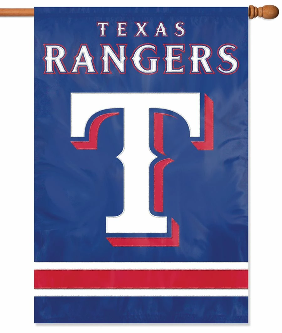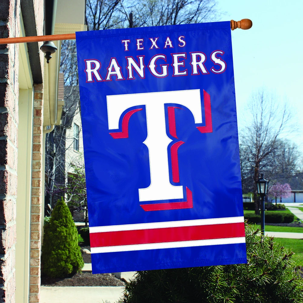 Display this beautifully crafted, official team logo, Texas Rangers decorative house flag on gameday or every day. All of the details are appliqued and embroidered and the lettering reads correctly from both sides. These flags are suitable to fly outdoors but attractive enough to hang indoors as well. Also makes a great gift for your favorite Rangers fan!