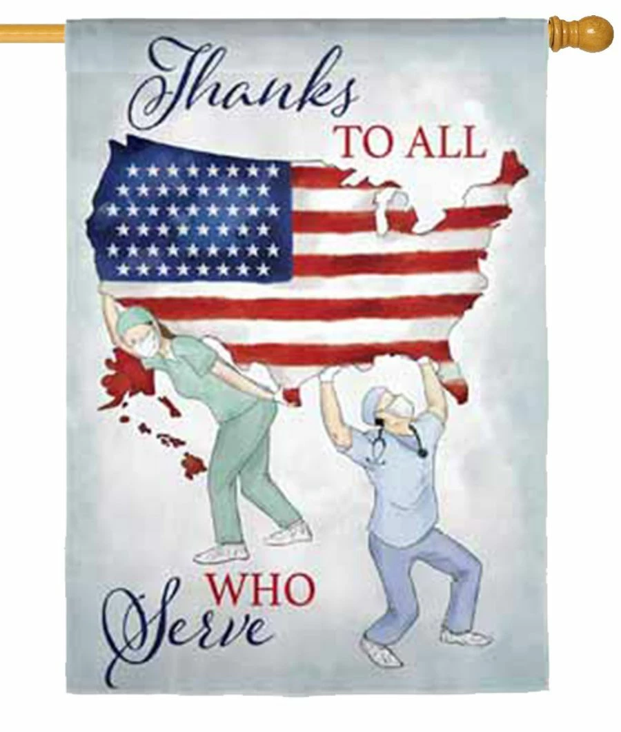Patriotic American style house flag depicting two medical professionals dressed in surgical masks and scrubs while symbolically supporting the entire nation. The “Thanks to All Who Serve” message reads correctly from both sides of the flag. Recognize all of our great, dedicated doctors and nurses who serve the medical needs of our communities, sometimes at their own personal risk, on a daily basis.