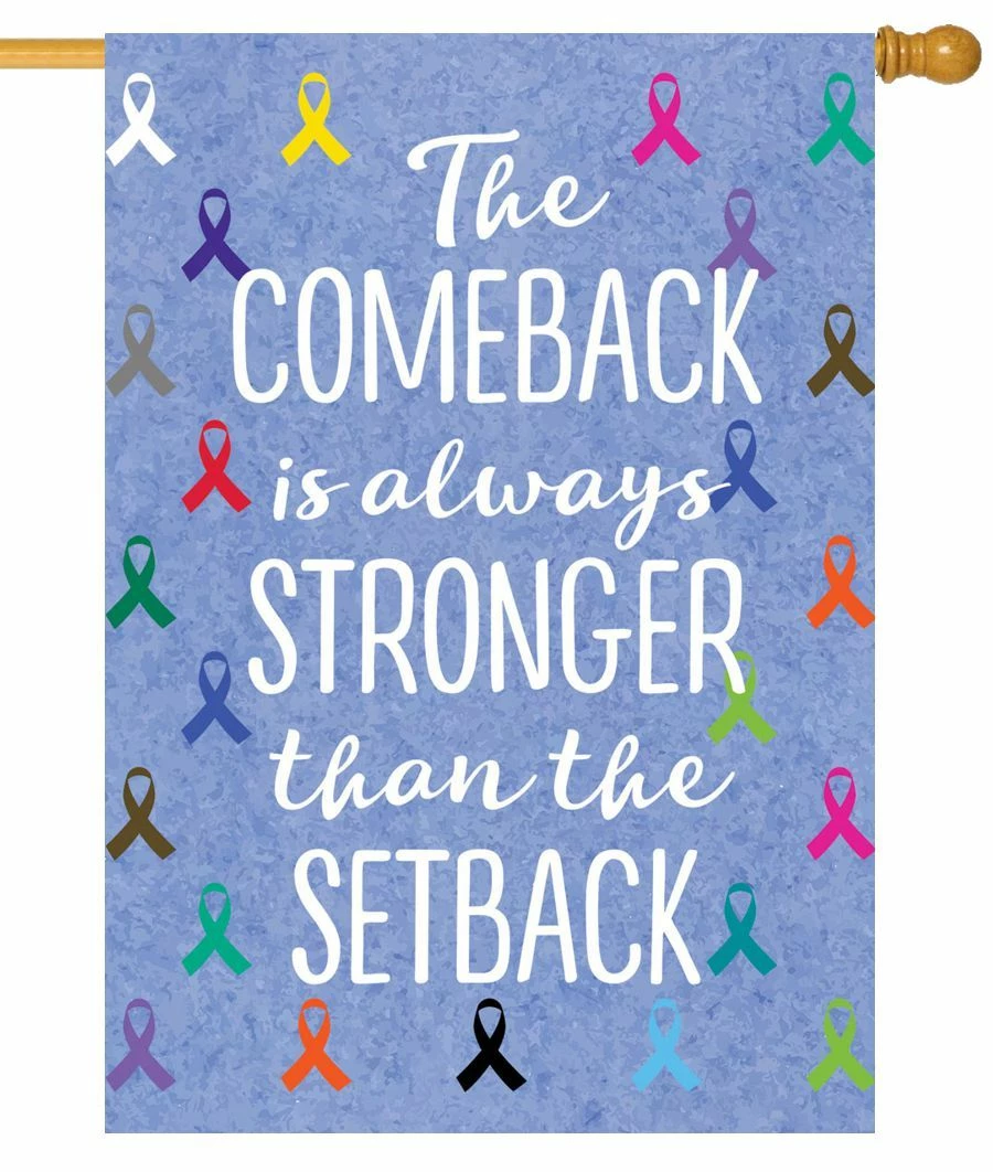Convey a philosophical message to those who come by your home or business with this double-sided decorative house flag. The message in the center of the flag reads, “The Comeback is always stronger than the Setback” in white lettering on a blue background. The background is filled with cancer awareness ribbons in white, orange, yellow, grey, and pink. This is a double-sided decorative house flag so the message and image read correctly from both sides.