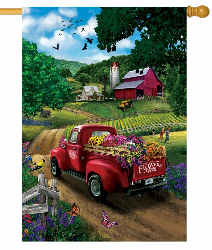 There is so much beauty in this single house flag. You have the old farmhouse up on the hill, the tractor by the barn, kids playing in the yard, beautiful birds, and butterflies. There are so many vibrant colors. This flag would look great on your home, barn, or business. Viewable on both sides. Please also look for the matching mailbox cover. Artist Bigelow Illustrations.