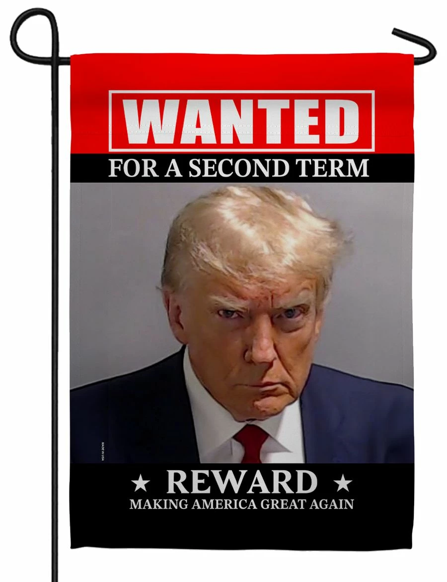 This Trump mugshot garden flag features an image of Donald Trump’s mugshot fashioned as a Wanted Poster. The lettering reads “WANTED – For a Second Term. REWARD – Making America Great Again” and is readable from both sides of the flag.
