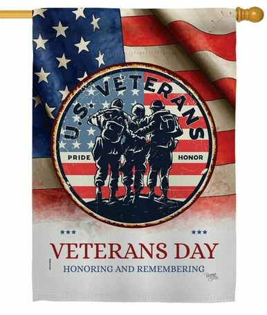 Honor all those who served with this military-themed house flag depicting a waving American flag with a vintage finish serving as the background for the rustic-looking round seal in the center of the design containing a somber silhouette image of two men in battle dress uniform helping a third injured comrade. “U.S. Veterans Honor Pride” and “Veterans Day Honoring and Remembering” are both printed in lettering that reads correctly from both sides of the flag. What a fitting flag to display on the outside of even inside your Home or business in observance of Veterans Day.