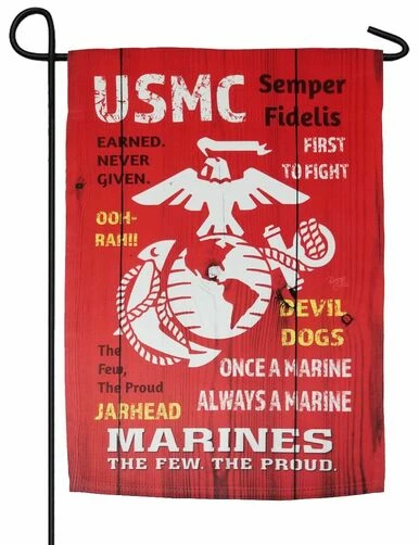 This United States Marine Corps garden flag is printed to look like a painted, wooden sign with a distressed finish. Several well-known Marine phrases appear to have been stamped on a red-painted wood plank background with the Marine Corps EGA in the center. All of the slogans are printed in dark gray, yellow, and white and read correctly from both sides of the flag:
