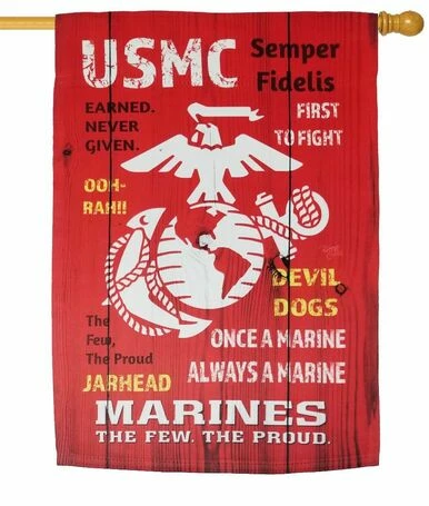 This United States Marine Corps house flag is printed to look like a painted, wooden sign with a distressed finish. Several well-known Marine phrases appear to have been stamped on a red-painted wood plank background with the Marine Corps EGA in the center. All of the slogans are printed in dark gray, yellow, and white and read correctly from both sides of the flag: