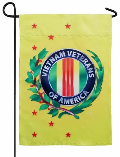 This commemorative Vietnam War garden flag features the Vietnam Veterans of America seal with the colors of the pre-communist Vietnam flag in the center. This design honors the sacrifice and bravery of our Military men and women who served in our struggle against the global spread of communism during the 1960s and ’70s.