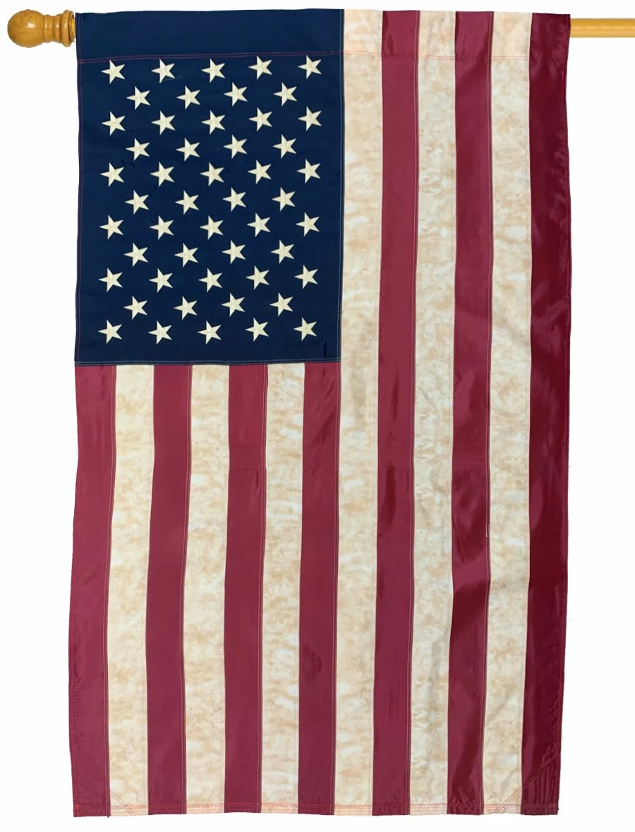 This beautiful sewn, and embroidered American flag is made of high-quality nylon fabric that is printed with an authentic-looking, tea-stained, aged finish (see pictures). If you are looking for an old-world, vintage appearance for your patriotic decor, this is it. You get the antique look of tea-stained cotton with the weather-resistant durability of nylon. This flag is finished with a pole sleeve designed to slide onto a wall-mounted flagpole.