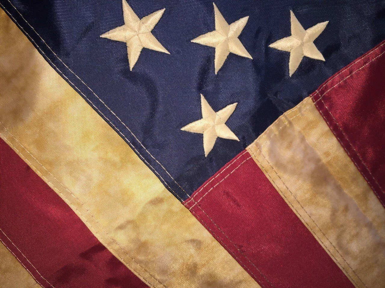 This beautifully sewn and embroidered American house flag is made of high-quality nylon fabric that is printed with an authentic-looking, tea-stained, aged finish (see pictures). If you are looking for an “old world”, vintage appearance for your patriotic décor, this is it. You get the antique look of tea-stained cotton with the weather-resistant durability of nylon.