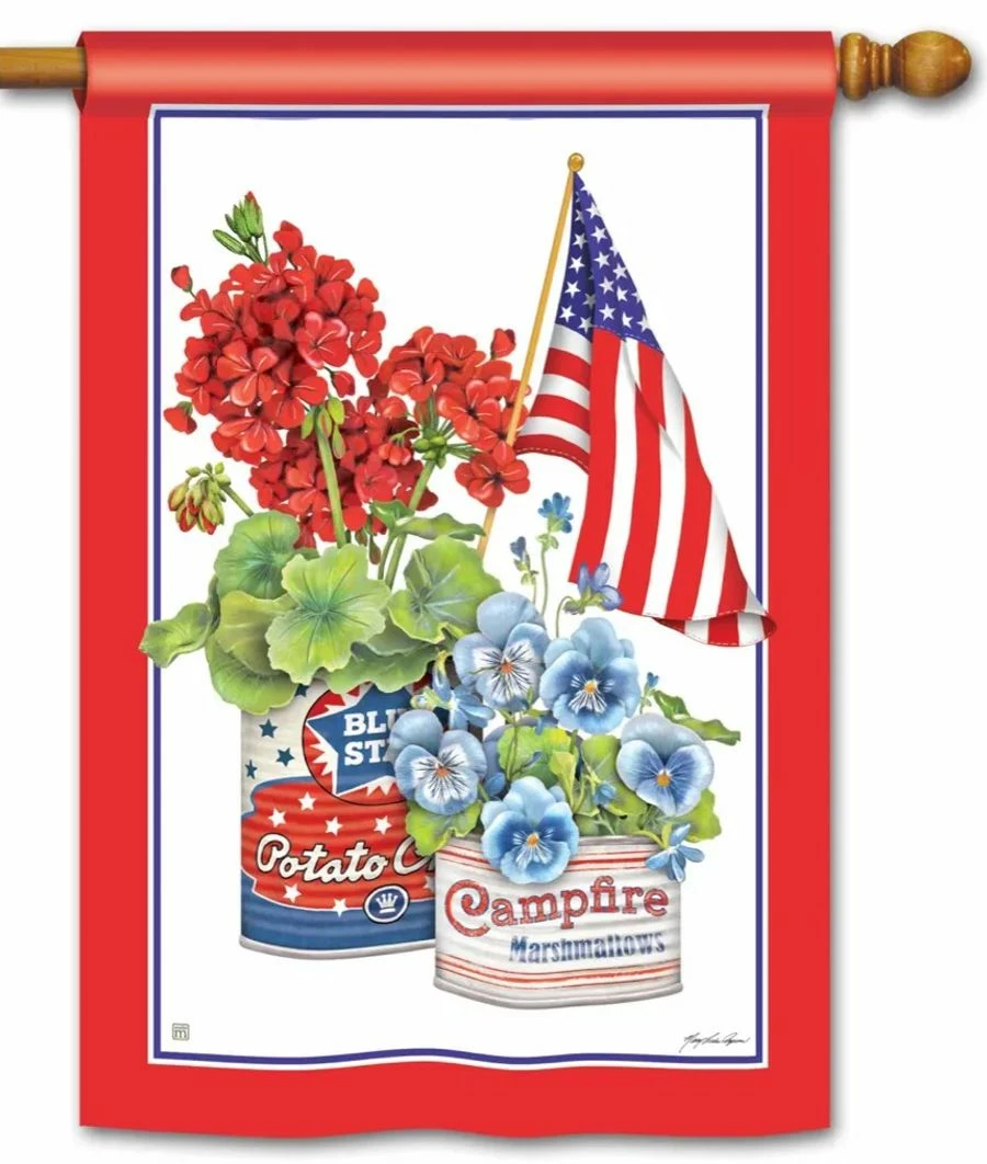 These red geraniums and blue pansies growing in vintage cans with the American flag is a beautiful house flag to have for the Fourth of July, patriotic-themed events, Memorial weekend, or everyday use at your office. I love how simple yet rich it is with its red, white, and blue colors throughout. This house flag is sure to impress!