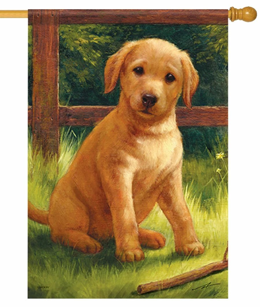 The adorable little puppy depicted on this decorative pet-themed house flag seems to be offering an invitation to play in the open green space that appears in the background. The artwork is visible on both sides of the flag.