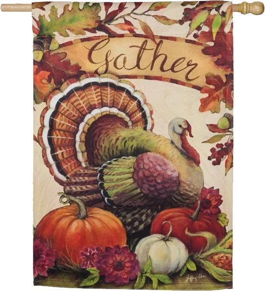 Celebrate Thanksgiving with this beautiful suede decorative house flag. A colorful turkey is depicted surrounded by fall leaves and pumpkins. A banner reads “Gather” across the top. The traditional feel of the artwork is the perfect complement to your Thanksgiving décor.