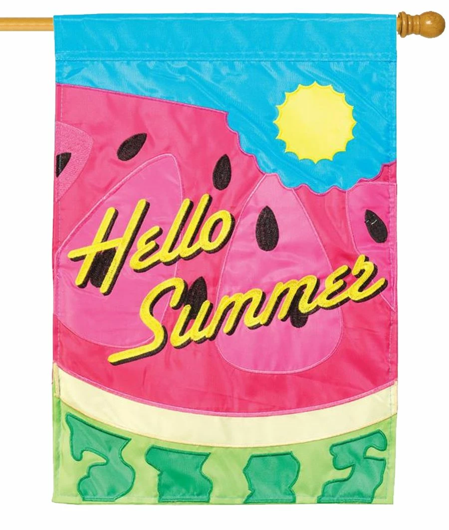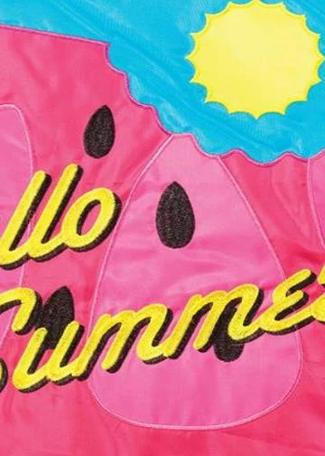 “Hello Summer” Watermelon Double Applique House Flag pictures a very large slice of watermelon, full of seeds and still on the rind. In the background we see a clear blue sky and the bright sun. It’s the perfect summer day! This wonderful brightly colored and amazingly stitched house flag will look great outside by your pool or outside of your business. The artwork and wording are on both sides of the flag.