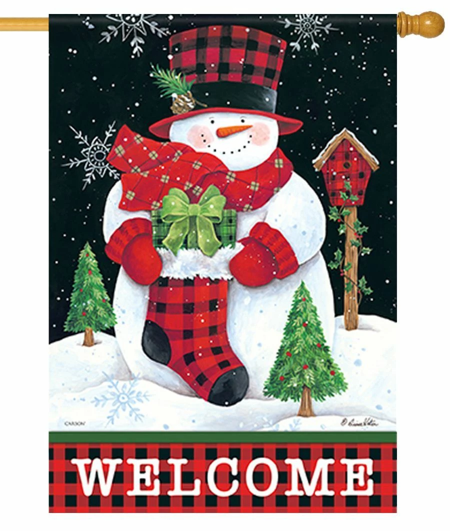 Christmas is a fun time with family and friends so enjoy it with this decorative house flag. The artwork shows a large snowman dressed in a red muffler, mittens, and a black and red top hat. The snowman holds a red and black stocking that is tied up with a green bow. Two small green trees are placed near the snowman. A red birdhouse is seen in the background. There is a snowdrift in the foreground while the snowy star-filled dark night sky serves as the backdrop The message reads across the bottom on a red and black checked border, “WELCOME” in black lettering. The image and message read correctly from both sides This is a fun decorative house flag to celebrate the Christmas season.