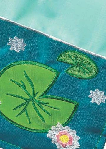 Beautifully embroidered dragonfly house flag with a “Welcome” message that reads correctly from both sides of the flag. There is a graceful trio of dragonflies all hovering above a pond full of water lilies against a colorful green and blue background. Hang this rich-looking design out at your Home or business for the summer season.