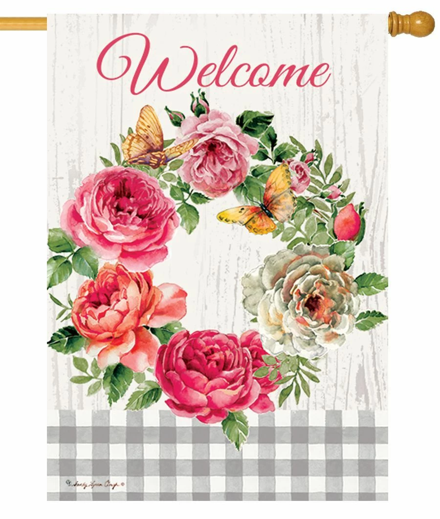 Add a touch of floral beauty anywhere you want it for the perfect motif with this decorative house flag. The image shows a circlet of lush roses on various hues of red and pink with yellow butterflies flitting among the blooms. The image is set against a whitewashed wood background. The message across the top reads, “Welcome” in grey script. A pale grey and white gingham border runs along the bottom. This is a double-sided decorative house flag so the lettering and image read correctly from both sides. This decorative house flag is perfect for everyone who enjoys the beauty of springtime throughout the year. Artwork by Sandy Clough.