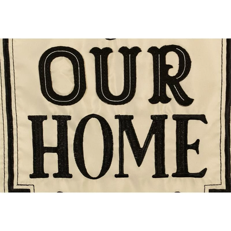 Here is a beautifully sewn and appliqued, welcome house flag for your indoor or outdoor décor. Elegantly fashioned, this design is perfect for welcoming friends and Family to your Home any time of year. The embroidered “Welcome to our Home” message reads correctly from both sides of the flag.