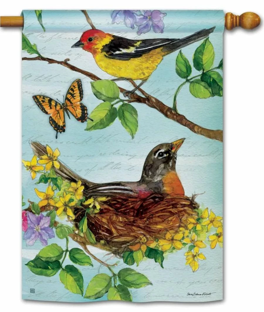 This lovely nature scene-themed house flag shows a bright and colorful Western Tanager perched above a nesting Robin while a gorgeous Monarch butterfly flutters by. What a colorful and beautiful way to celebrate the great outdoors. The artwork appears on both sides of the flag.