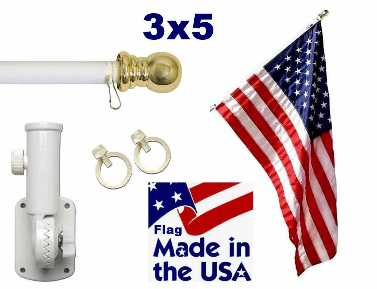 6′ white tangle-free rotating flagpole and adjustable bracket with nylon sewn stripes and printed stars flag kit.