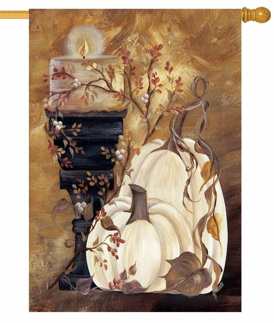 This elegant painting of white pumpkins illuminated by candlelight is rendered onto a house flag that will add a beautiful artistic touch hanging up at your Home or business for the autumn season. This sophisticated design is made for outdoors, but is also attractive enough to display inside as well. Artwork by Michelle Musser