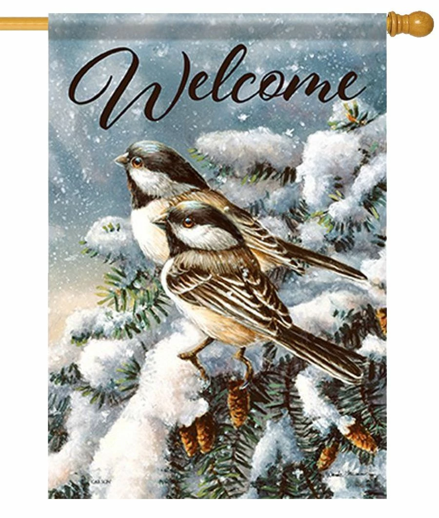 Share the beauty of winter with this decorative house flag. The artwork shows two chickadees perched among snow-covered pine boughs. This is a truly beautiful winter scene. The message reads, “Welcome” in a dark script. The message reads correctly from both sides. This is a beautiful winter decorative house flag to display throughout the winter season.