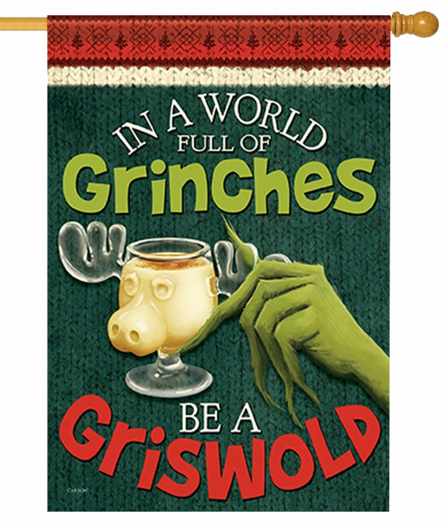 This is a great dual holiday house flag. “In a World Full of Grinches, be a Griswold” gives mention to both fantastic Christmas films. It features a knitted background, a moose glass full of eggnog and a long Grinch hand holding it. Perfect for your home or business this holiday season. The wording reads correctly on both sides of the flag.